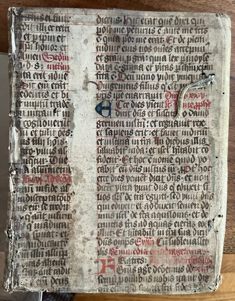 Here, with added ties to close the printed book, appears part of a 2-column page of text written in ink, with enlarged 2-line inset initials rendered alternately in blue or red pigment, rubrication written in red pigment for headings, and added strokes of red pigment to mark and highlight in minor text initials within the columns. Red lines set out the rulings for the lines and columns of text.