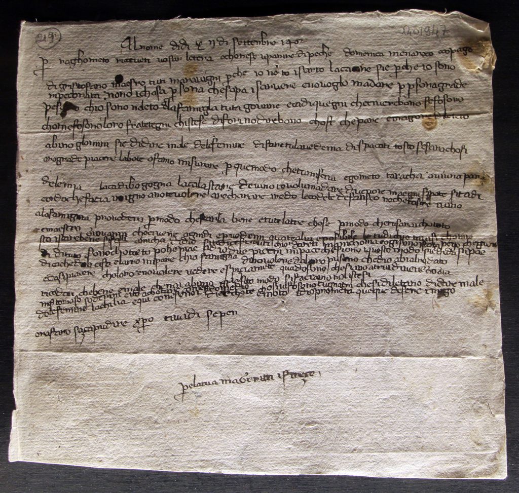 Prato, Palazzo Datini. Letter of 9 December 1402 by Margherita Bandini to Francesco Datini from Florence to Prato. Image via Sailko, CC BY 3.0 <https://creativecommons.org/licenses/by/3.0>, via Wikimedia Commons.