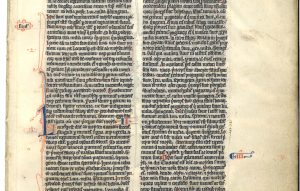 Single leaf with three columns of 53 lines of a delicate French university bookhand, small initials in red or blue with undulating lines in same forming line-fillers, larger initials in same with contrasting penwork, running titles a or b in red with blue penwork twirls at their sides, slight cockling and discolouration at edges from use, small holes in corner of one leaf, else excellent condition, 285mm x 190 mm. (written space: 187 by 125 mm.) Text is 1 Samuel 2-3.