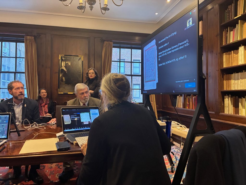 Like our pair of hybrid workshops recently over original manuscript and printed materials in Special Collections at the Princeton University Library, held by our Associate Eric White at the 2025 RGME Colloquium on Fragments (see below), this hybrid workshop took place over original materials at the Grolier Club, guided by the Librarian Jamie Cumby (see also Jamie Cumby).
